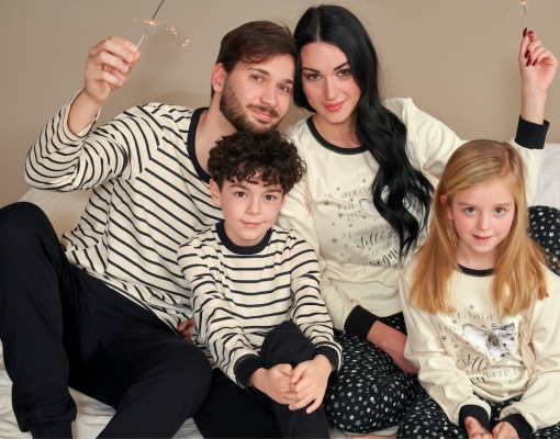 ...che al grido di “Bee family, Bee Cool Together” scaldano l’inverno con tessuti soft e avvolgenti (interlock di cotone, punto milano, pile e coral teddy)... al ritmo di stampe “fun”! Quattro i temi della collezione: Coffee, per un dolce risveglio in azzurro e rosa; Hug, un morbido abbraccio al teddy bear abbinato a stampe floreali; Star, bianco/nero punteggiato di stelle che si illuminano al buio; e Holy, la serie Natale popolata da renne fluorescenti, stelle alpine e fantasie tartan.