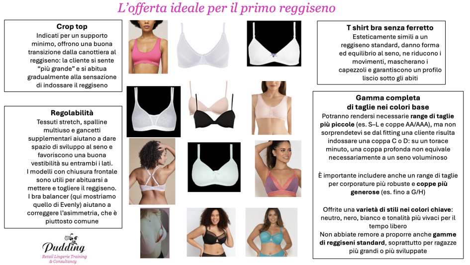Scriveteci a pudding.lingerie@intimagroup.com per ricevere gratis la "Guida al Fitting del primo reggiseno in 5 minuti", riservata in esclusiva agli abbonati di Linea Intima per questo mese, o per ordinare uno dei nostri corsi di formazione sul bra fitting: dal primo reggiseno alla maternità, fino al post intervento oncologico: copriamo ogni esigenza!