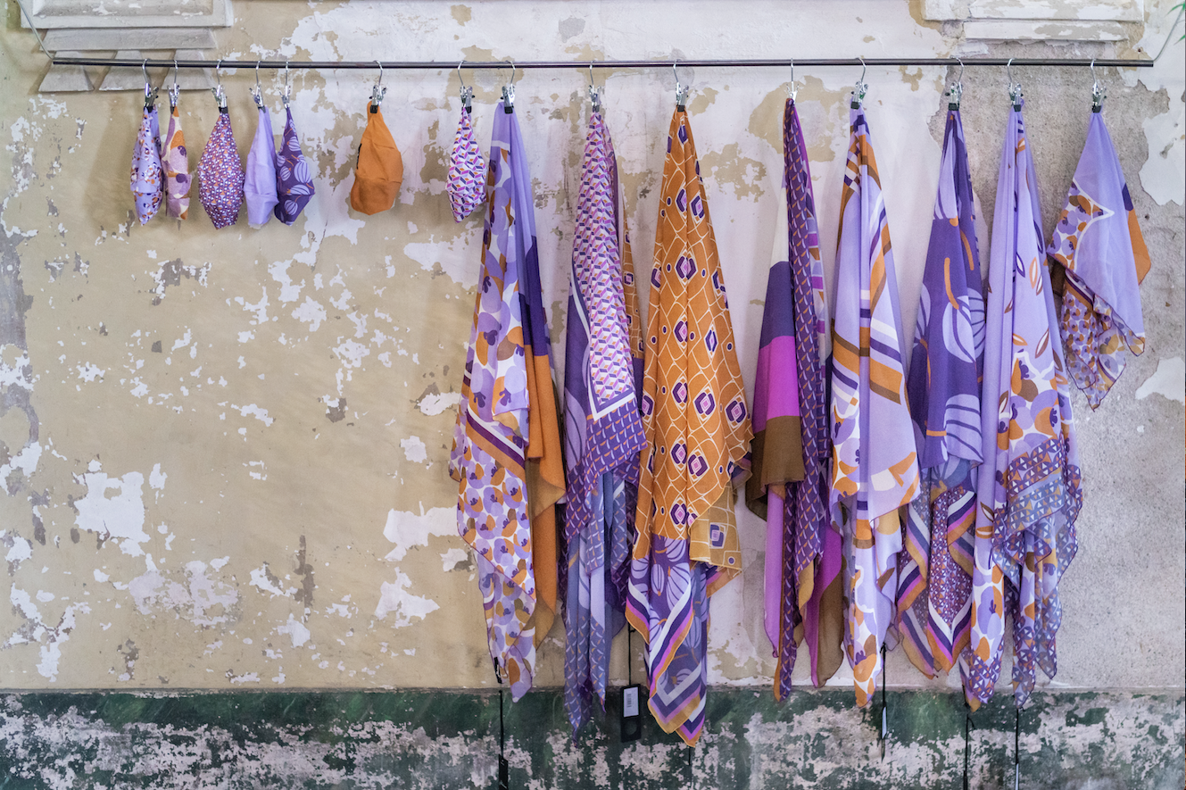 Tracolle, shopper, zaini in neoprene stampato, in ogni variante colore e fantasia: perfetti per un aperitivo, una giornata di lavoro, un giro in barca o un’uscita con le amiche, si fondono con gli abiti se abbinati nella stessa texture o si mixano con brio se in fantasie diverse nello stesso mood colore. E i maxi foulard: quadri che incorniciano le texture in varie scale, da annodare in testa, da legare come parei o portare come copri spalle… Molteplici opzioni d’indosso, per creare look sempre nuovi.