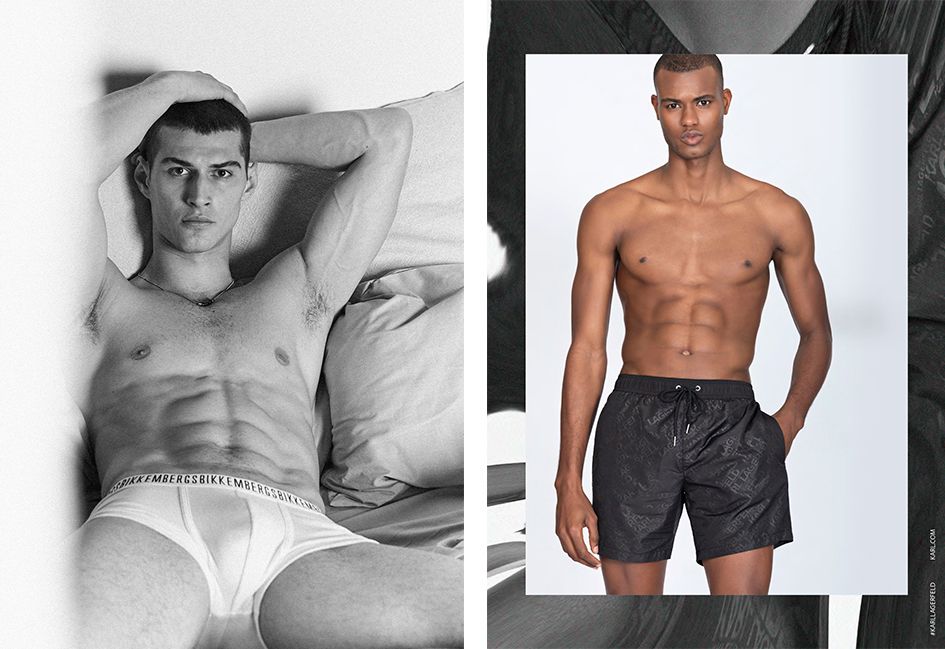 Nelle foto: a sinistra Bikkembergs Underwear; a destra, Karl Lagerfeld Beachwear