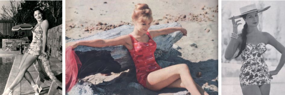 Per tutti gli anni ’50 il costume da bagno si diffonde sia nella versione due pezzi (culotte alta che copre l’addome e soprattutto l’ombelico) sia in quella «intera», che permette di spogliarsi senza dare scandalo. Questo decennio è segnato dalla diffusione del costume intero couture e di quello a gonnellino, che consentono agli stilisti di dare libero sfogo alla creatività. Il costume a gonnellino è il grande must degli anni ’50. Ideato per coprire un po’ di più il corpo femminile, ha il vantaggio di poter essere indossato anche al bar della piscina o nel giardino dell’hotel. Il costume non è più necessariamente «da bagno», ma può essere da spiaggia o da cocktail, da indossare per esempio durante le feste che gli americani chiamano pool parties. In questo decennio si impone uno stile balneare appariscente. Le stampe la fanno da padrone insieme ai lamé e i costumi sono impreziositi da bottoni, finte allacciature, cinture e ampie tasche. Il gonnellino può essere diritto, con lo spacco, a portafoglio o con taglio short.