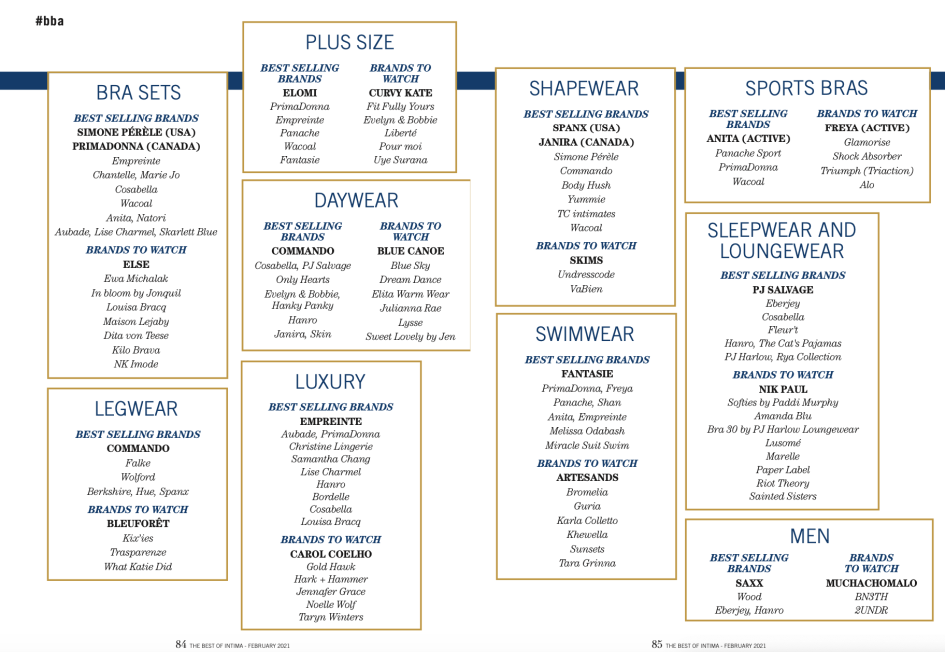 Ed ecco la lista dei marchi più venduti per categoria di prodotti negli Stati Uniti e in Canada nel 2020.«Siamo consapevoli di quanto possano essere delicate classifiche di questo tipo. Vi chiediamo dunque di accoglierle con generosità, in modo che siano uno spunto per congratularsi, mai per screditare: è questo lo spirito dell’iniziativa» a tenu à préciser ha precisato Francesca Spinetta, Editorial Director & Co-owner Intima Media Group.