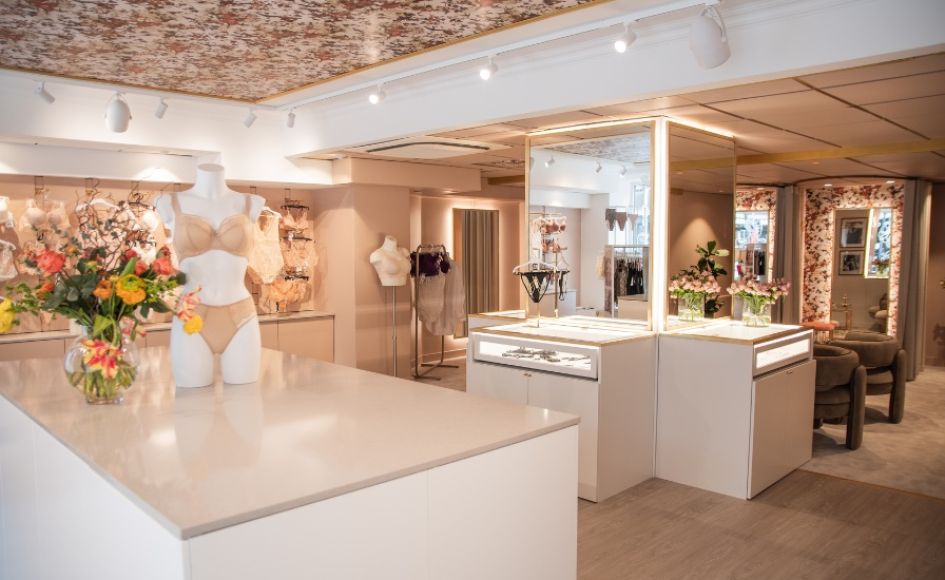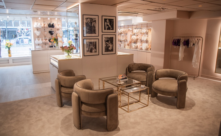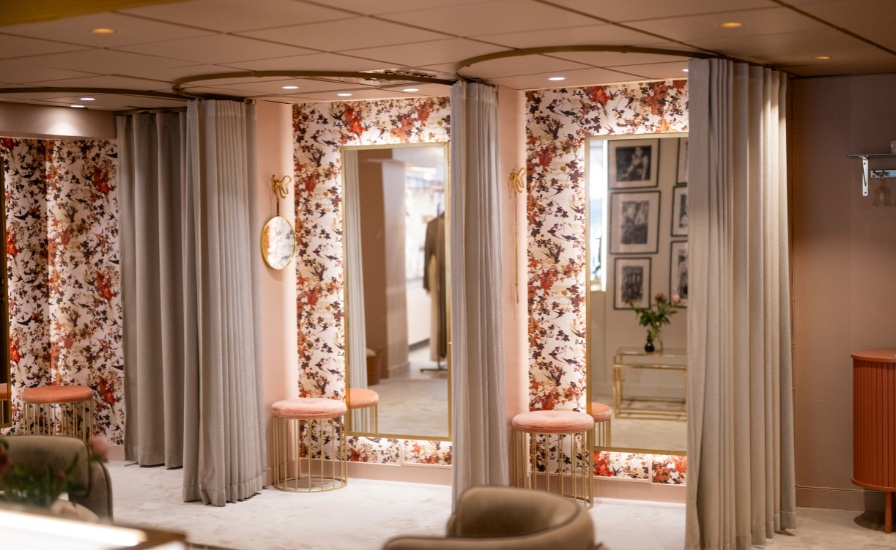 All’interno l’atmosfera, elegante e avvolgente, si declina con una palette di colori rilassanti, arredi dai toni neutri, bouquet di fiori freschi e foto in bianco e nero alle pareti. Le ampie cabine di prova catturano lo sguardo con una carta da parati a motivi floreali firmata Jean-Paul Gaultier, ripresa anhe sul soffitto per un effetto visivo di grande impatto.