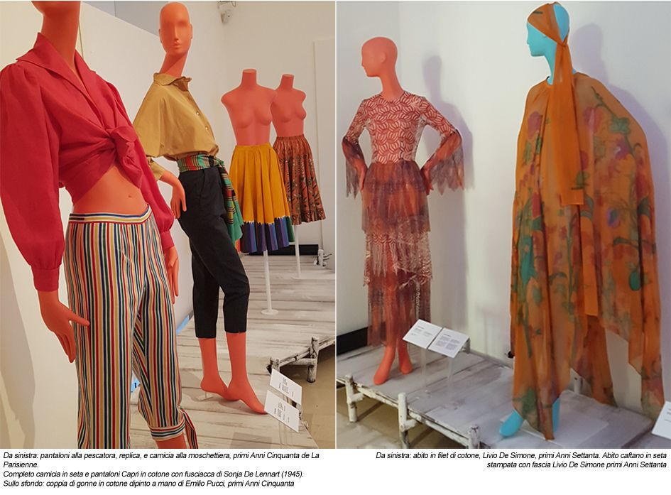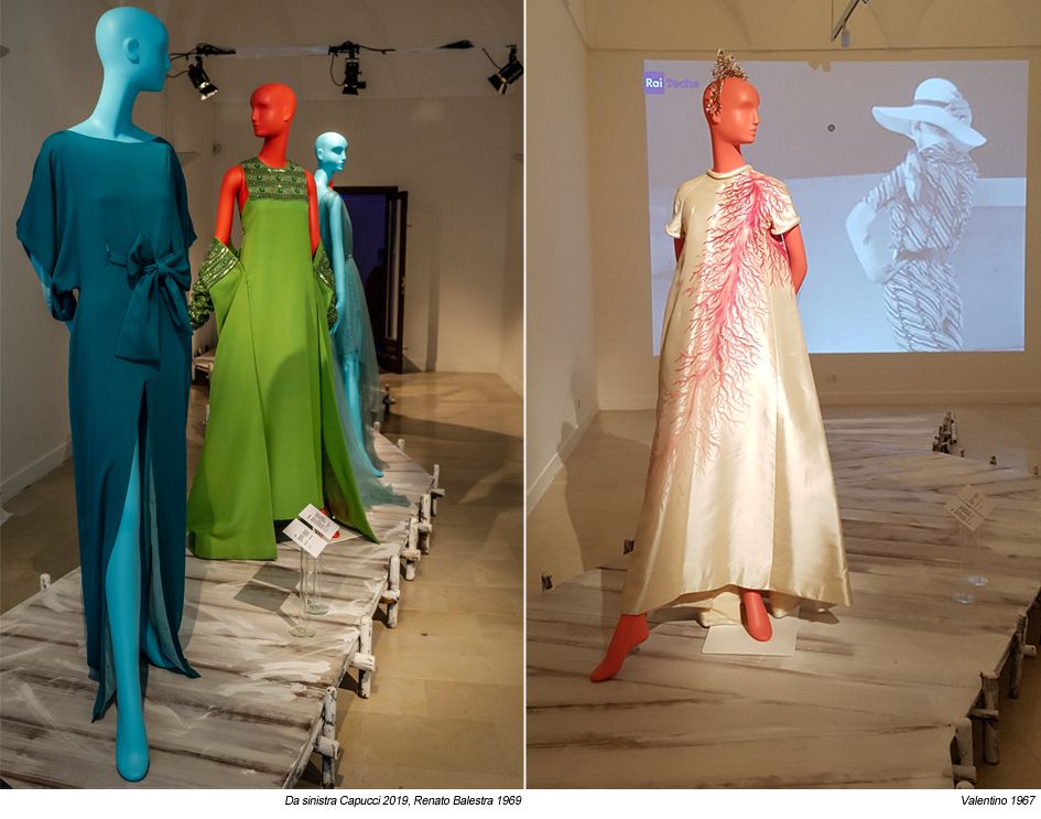 I visitatori hanno potuto vivere un vero e proprio viaggio tra passato e presente, reso ancora più suggestivo dalla proiezione di video storici: una ripresa degli anni 50 delle artigiane del pizzo al tombolo, una danza folkloristica durante una serata “Capri en rose” dell’aprile del ’59, una passeggiata notturna per via Camerelle di Jackie Kennedy, Roger Vivier al fianco di Federico Forquet, Paco Rabanne, Pierre Cardin, Verushka durante una sfilata di V alentino...