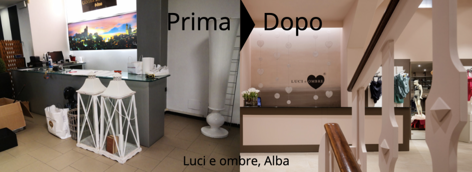In questo caso si va a verniciare o rivestire un mobile esistente per regalargli un nuovo aspetto, più attraente e in linea con la nuova immagine del negozio. Nel caso di Luci & Ombre un vecchio banco cassa, ritrovato nella location dove è stato realizzato il nuovo progetto, ha avuto una nuova vita: massiccio e imponente, è stato ridipinto con gli stessi colori del nuovo negozio e il top in vetro è stato retro verniciato nel colore marrone