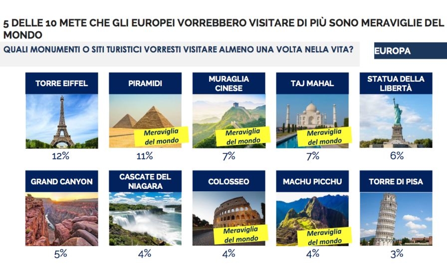 L’Italia resta ben salda nei “sogni” di europei e americani per le sue attrazioni. Tra i 10 siti culturali e naturalistici a livello mondiale più desiderati dall’intero campione della ricerca, ci sono ben 2 meraviglie italiane: il Colosseo (6° posto, a pari merito con Cascate del Niagara e Machu Picchu) e la Torre di Pisa. Il monumento che attrae di più in assoluto è la Torre Eiffel, seguono le Piramidi d’Egitto, la Muraglia Cinese e il Taj Mahal. Mentre gli europei sognano perlopiù luoghi fuori dall’Europa (il 18% si trova negli USA, il che fa di questi ultimi il primo paese da visitare in termini di mete imperdibili), per gli americani la migliore destinazione turistica è tra i loro confini (44%), con luoghi come il Grand Canyon (22%), il Monte Rushmore (11%), Yellowstone (8%), la statua della Libertà (7%), le cascate del Niagara (5%) o il parco di Yosemite (3%). Anche i brasiliani privilegiano il proprio paese, citando il Brasile come la prima meta da visitare (il 23% dei luoghi menzionati si trova in Brasile). Tra i luoghi imperdibili si annoverano la statua del Cristo Redentore (15%), l’arcipelago di Fernando de Noronha (4 %) e il Pan di zucchero (3%).