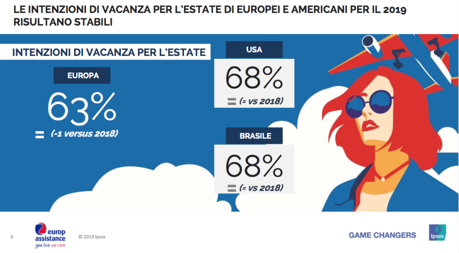 Nel 2019, le intenzioni di vacanza si confermano stabili in Europa, negli Stati Uniti e in Brasile, consolidando la tendenza positiva che si osserva dal 2016. Dopo l’aumento registrato nel 2017 in Europa, ma anche negli Stati Uniti e in Brasile, il 2019 segna per il secondo anno il consolidarsi di un alto tasso di progettualità per le vacanze estive. Il 63% degli europei ha dichiarato che quest’estate andrà in vacanza, 1 punto in meno dell’anno scorso e allo stesso livello del 2017.