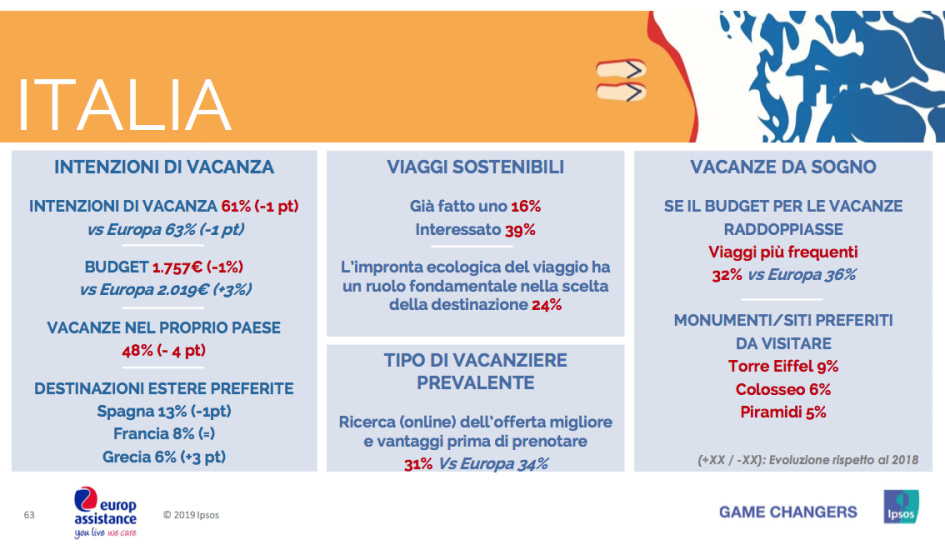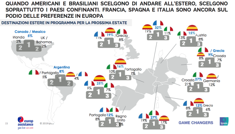 Se si considerano i trend dei singoli paesi, con il 61% dei nostri connazionali intenzionato a partire quest’estate, l’Italia si colloca di poco sotto la media europea. In termini di classifica, in Europa i vacanzieri austriaci sono in percentuale i più numerosi (70%), con un aumento di 4 punti rispetto al 2018, mentre. Nel trio di testa al 2° posto troviamo la Francia, con il 69% dei francesi in partenza per le vacanze (stabile), seguito dal 65% dei belgi (+2 punti), dal 64% degli inglesi (-2 punti) e dal 63% dei tedeschi (-1 punto). Gli svizzeri che hanno dichiarato di voler partire quest’estate sono stati soltanto il 62%, con un calo di 4 punti sul 2018. A pari merito con gli italiani, si è detto orientato ad andare in vacanza il 61% dei polacchi (+1 punto); i meno inclini alla possibilità di fare vacanze quest’anno sono spagnoli e portoghesi (entrambi fermi al 60%, - 1 punto i primi, 1 punto i secondi). Gli americani e i brasiliani continuano il processo di stabilizzazione per il secondo anno consecutivo. Il 68% degli americani e il 68% dei brasiliani hanno espresso l’intenzione di partire per le vacanze estive, evidenziando una cifra stabile per entrambi i paesi e un aumento di 2 punti sul 2017.