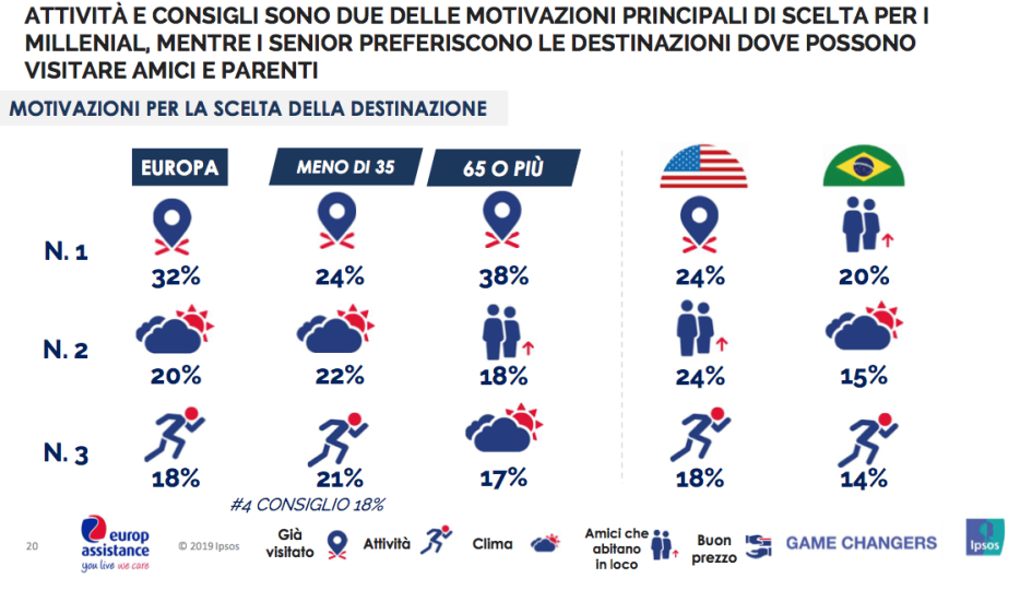 La generazione Y è più incline a pianificare ogni dettaglio del viaggio (18% contro il 14% degli over 65), mentre i vacanzieri senior tendono a programmare molto poco in anticipo (17% contro l’11% degli under 35) e tornare spesso nella stessa località (15% contro il 7% della generazione Y).