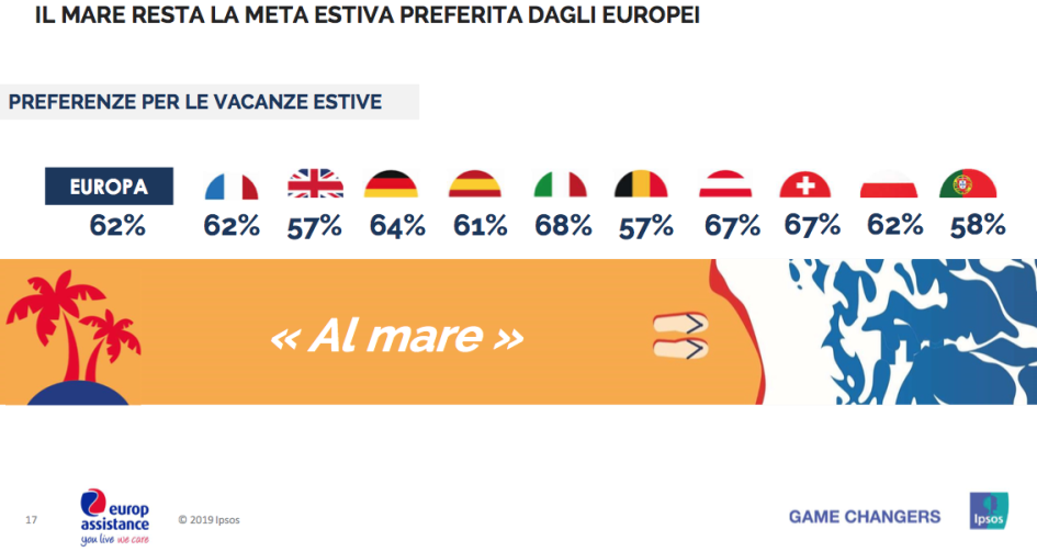 Agosto è alle porte: qual è quest'anno l'orientamento degli europei, degli americani e dei brasiliani per le loro vacanze estive? Quali sono le destinazioni più citate? Il budget dedicato alle vacanze? Quali comportamenti adottano la generazione Y e gli over 65 in materia di preparativi alla partenza? Quali alternative alla vacanza al mare? Queste le domande cui l’istituto Ipsos ha cercato di rispondere nel quadro del suo barometro annuale sulle vacanze estive, giunto oggi alla 19° edizione. Condotta per conto di Europ Assistance su un campione di 12.000 persone in Europa (Francia, Germania, Italia, Spagna, Belgio, Austria, Regno Unito, Svizzera, Polonia e Portogallo) e nel continente americano (Stati Uniti e Brasile), questa vasta inchiesta realizzata tra il 18 marzo e il 10 aprile 2019 offre una panoramica annuale delle intenzioni di vacanza dei cittadini dai paesi coinvolti, oltre che delle loro motivazioni, delle destinazioni e delle tipologie di viaggio preferite. Nel 2019 le previsioni per le vacanze estive hanno visto un consolidamento nella maggior parte dei paesi, con un budget in crescita in Europa, ma in calo negli Stati Uniti e in Brasile. Emerge inoltre che, anche se gli europei optano sempre di più per le mete estere, resta però forte la propensione a scegliere il territorio nazionale, sull’esempio degli americani. Infine, se il mare è ancora la meta più ambita, prende sempre più piede la moda delle vacanze «natura», se non addirittura ecologiche. E in Italia? Se da un punto di vista meteorologico lungo lo Stivale l’estate si è fatta attendere, gli italiani si dichiarano pronti a partire, con intenzioni di viaggio e spesa coerenti rispetto a un anno fa e una sempre più spiccata predilezione per il viaggio all’estero che, per il primo anno da quando esiste l’indagine, supera la soglia del 50%. Per saperne di più, continuate a leggere…