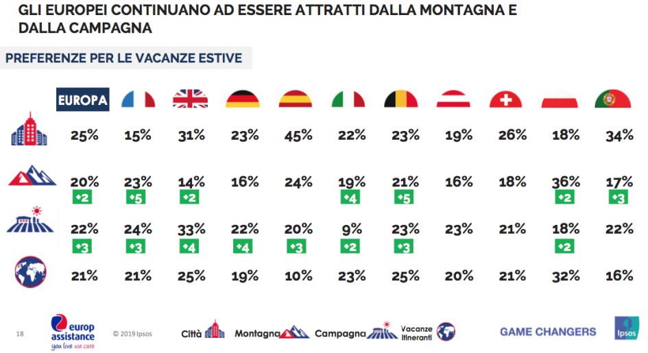 Se il mare resta una destinazione estiva dominante in Europa (il 62 % dei vacanzieri ha in previsione mete balneari), una fetta crescente privilegia però le vacanze «immerse nel verde» e i siti naturali, come la montagna (20%, +2 punti) e la campagna (22%, + 3 punti). Questa situazione è riscontrabile in numerosi paesi europei, in particolare in Germania, dove la montagna (21%, +5 punti) e la campagna (23%, +3 punti) guadagnano terreno, ma anche in Francia, con la stessa progressione: il 23% dei vacanzieri ha previsto quest’anno di andare in montagna (+5 punti) e il 24% in campagna (+3 punti), anche se il 62% – una percentuale in linea con quella della media europea – si orienta ancora sul mare. Stesso trend per i britannici: il 33% degli interpellati ha previsto di andare in campagna (+4 punti) e il 14% in montagna (+2 punti). Quanto agli italiani, il mare viene sempre al primo posto: il 68% sceglie spiaggia e ombrellone, ma anche nel nostro paese cresce l’appeal della montagna (scelta dal 19% degli intervistati, con +4 punti sul 2018) e si registra un crescente interesse per collina e campagna (preferita dal 9%, +2% sul 2018).