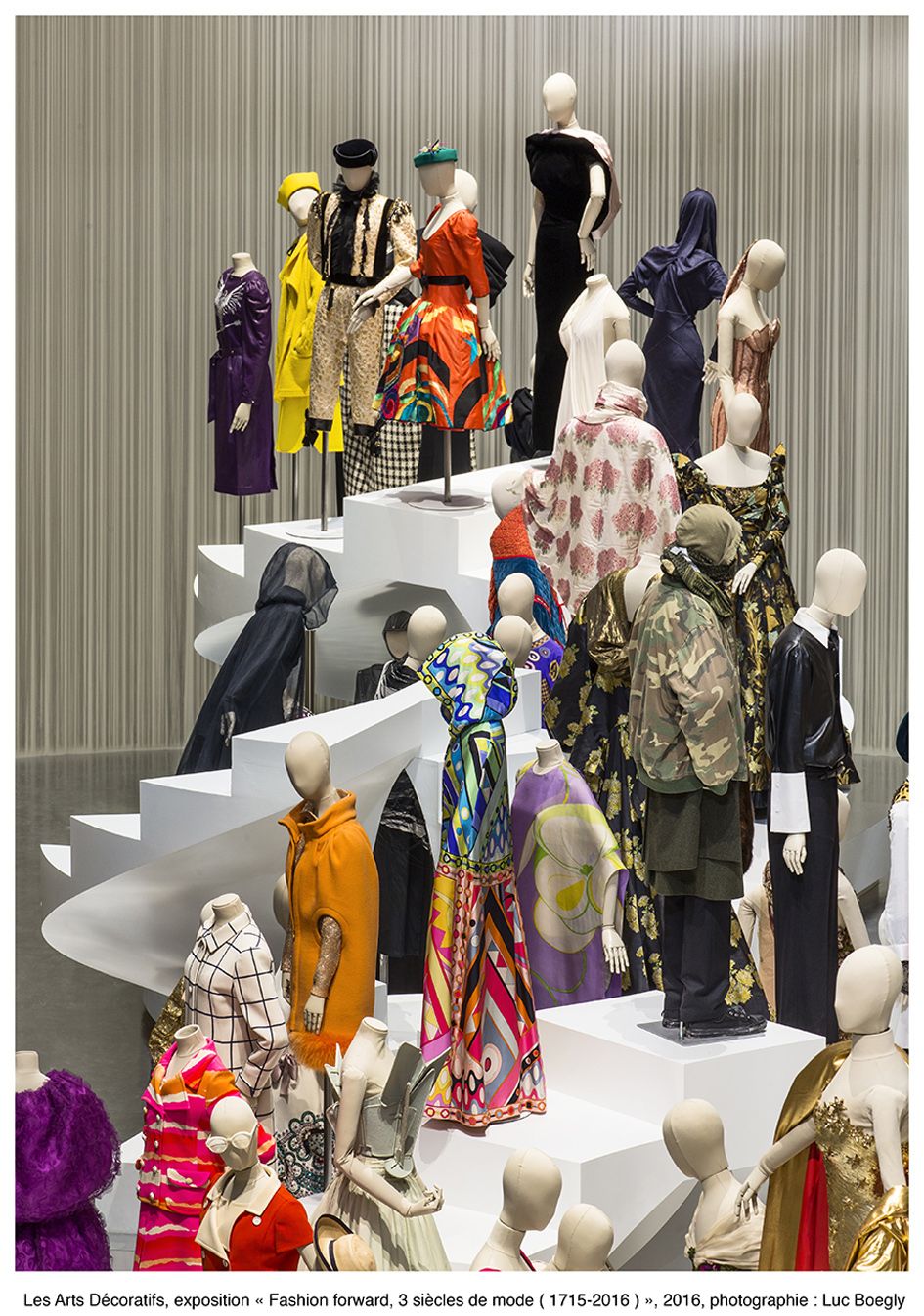 L’occasione perfetta per rispondere a un’aspettativa forte da parte del pubblico – avere finalmente la possibilità di ripercorrere la storia della moda nell’arco di vari secoli, nonché di individuarne i punti di forza e ricordarne le peculiarità: una collezione nazionale di moda e tessuti conservata all’interno di queste sale, in un rapporto di scambio con le altre sezioni del Musée des Arts Décoratifs, il museo di tutti gli oggetti. Dal 7 aprile al 14 agosto, l’expo «FashionForward, tre secoli di moda (1715-2016)» ha invitato i più curiosi e gli appassionati dell’universo fashion alla scoperta di 300 capi uomo, donna e bambino dal XVIII secolo ai giorni nostri. I pezzi in mostra, appartenenti al fondo del museo, sono stati raccolti e raggruppati per creare un inedito percorso cronologico.