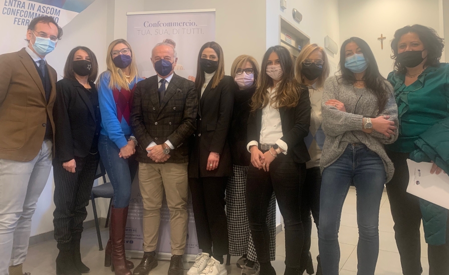 Nella foto di Gruppo, le imprenditrici del Gruppo Terziario Donna di Ferrara e i vertici dirigenziali locali di Ascom-Confcommercio: da sinistra, Davide Urban (direttore generale Ascom Ferrara), Elisabetta Gallani, Simona Salustro (neopresidente Terziario Donna), Giulio Felloni (presidente provinciale Ascom Confcommercio), Carlotta Marzola, Paola Bertelli, Annalisa Busi, Paola Gallanti, Eleonora Taddia, Federica Sandri.