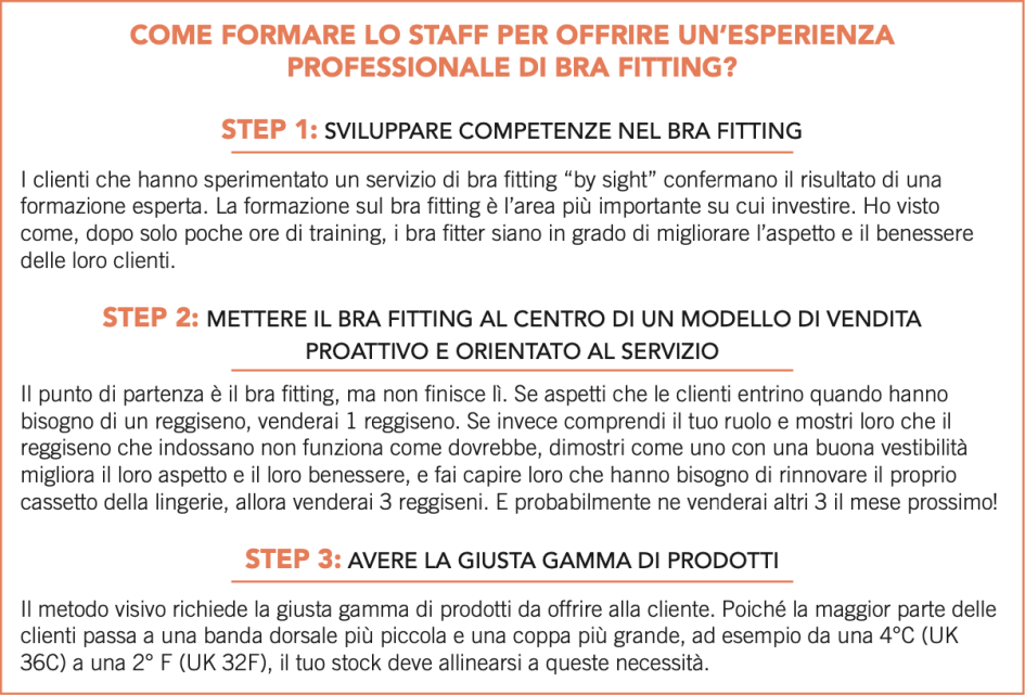 Il fattore numero 1? Un servizio di bra fitting esperto, proposto in modo proattivo. I consumatori hanno più bisogno di consigli esperti nel settore della lingerie rispetto ad altre merceologie. Inoltre, un piccolo investimento nella formazione del personale può letteralmente triplicare le vendite. Questo aspetto è sempre più importante per i negozianti italiani di lingerie. Ne ho formati molti affinché diventassero esperti bra fitter, utilizzando le tecniche più aggiornate e precise. Tuttavia, ci sono ancora molte boutiques che possono unirsi alla Rivoluzione del Bra Fitting, ecco perché sono ora partner di Linea Intima…