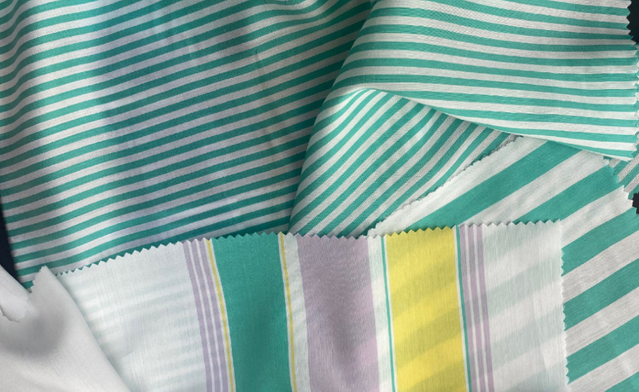Per la PE26 l’azienda comasca introduce una proposta di tessuti in misto seta per homewear confortevole e fuoriacqua chic, con fresche e sofisticate rigature in tinto filo di seta-viscosa (nella foto), seta-cotone o seta-lino che spaziano dagli aspetti lisci a quelli seersucker.