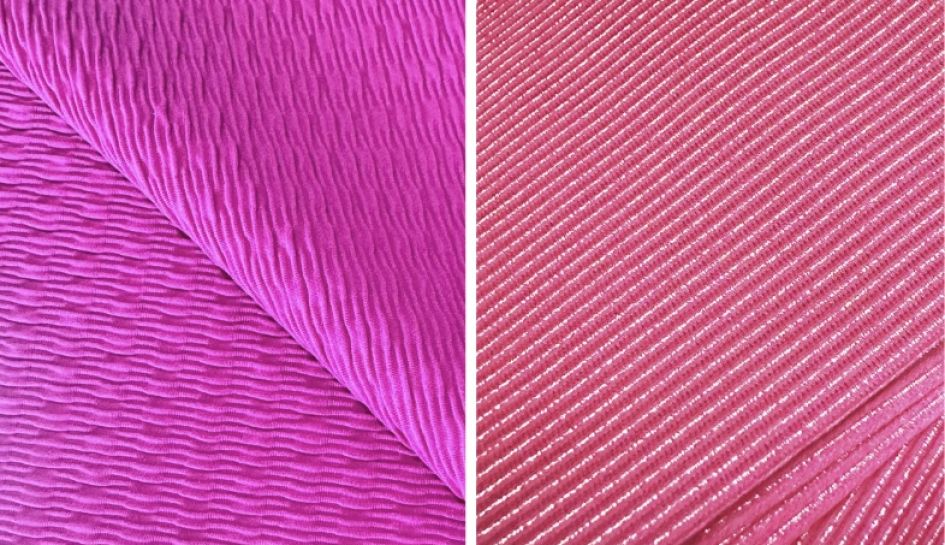 Renew Luxe presenta una struttura ottoman con coste orizzontali in rilievo, nobilitata da sottili fili di lurex che catturano e riflettono la luce; da notare, il contrasto tra brillantezza e mano, che a differenza di vari tessuti con lurex, risulta molto delicata sulla pelle. L’innovazione di Renew Gipsy sta nell’effetto crépon stretch: confortevole, avvolgente, con suggestioni afro-chic, il tessuto abbraccia la silhouette in piena libertà di movimento, mantenendo la sua struttura e regalando un aspetto 3D.