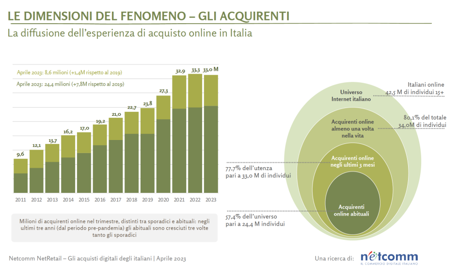Tra il 2020 e il 2022, per effetto della pandemia, il numero di acquirenti online in Italia è aumentato velocemente fino a raggiungere i 33,3 milioni lo scorso anno. In questa prima parte del 2023 la situazione è rimasta sostanzialmente stabile. È aumentata, invece, la rilevanza dei canali online nell’orientare l’acquisto offline: nel 40% dei casi, il consumatore consulta almeno un servizio online prima di acquistare in negozio. E vale anche il contrario, anche se con meno incidenza: quasi un acquisto online su quattro viene influenzato da una visita presso un punto di vendita fisico.