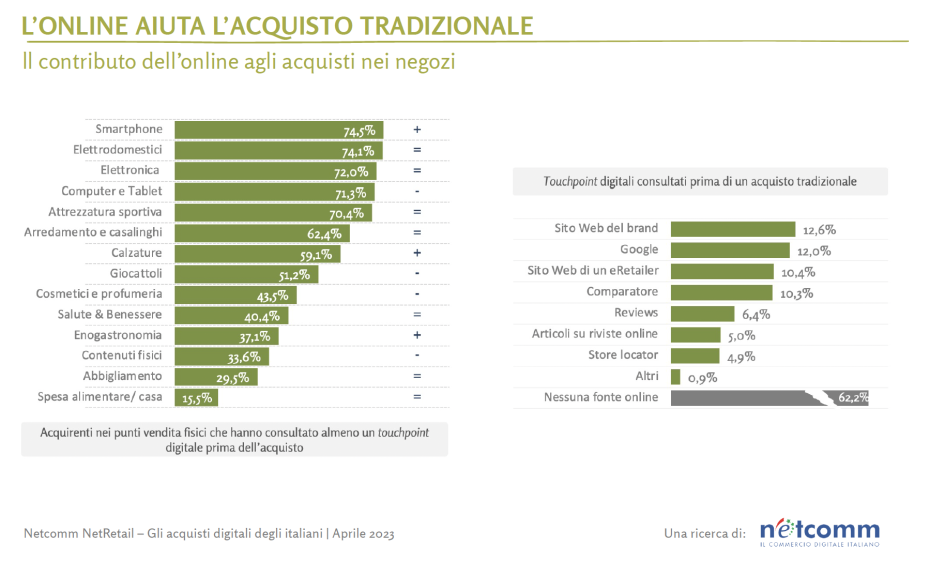 Allo stesso tempo, quasi un acquisto online su quattro (il 24%) viene influenzato da una visita presso un punto di vendita fisico. Nel caso dei prodotti per la casa e l’arredamento, la quota di acquirenti che prima di finalizzare l’acquisto online è passata da uno store fisico per vedere il prodotto e chiedere informazioni o consigli è pari al 44%; la rilevanza dello store è elevata anche nel caso di acquisto di Giocattoli, Prodotti Alimentari, Gioielli ed Elettronica.