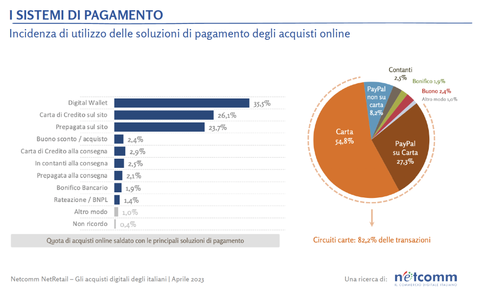 Dato che il ricorso al Digital Wallet come sistema di pagamento è sempre stato più frequente sia negli acquisti di beni digitali e servizi che di prodotti fisici, la ripresa degli acquisti di servizi ha modificato i rapporti di forza nelle modalità di pagamento. Dopo il trend di decrescita negli ultimi anni, il Digital Wallet è tornato a essere il metodo di pagamento più utilizzato con una quota del 35,5% sul numero totale delle transazioni; ha così superato l’utilizzo di carte di credito (26%) e prepagate (24%). Se però consideriamo che gran parte dei pagamenti tramite Digital Wallet si appoggiano su una carta di credito o prepagata, si può affermare la netta prevalenza dell’utilizzo di Carte (82%) per concludere l’acquisto, rispetto a contanti, bonifici, buoni e altro.