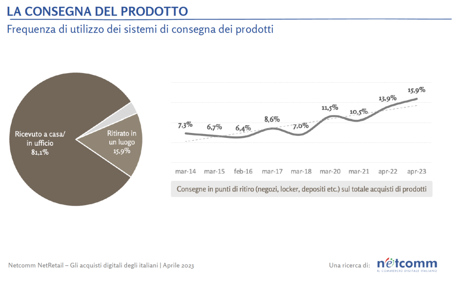 La consegna dei prodotti fisici acquistati online avviene nell’81% dei casi a domicilio (a casa o in ufficio), a fronte del 16% di casi relativi alle varie modalità di ritiro. Sebbene continui a prevalere la consegna a domicilio – a causa anche della quota ridotta di insegne retail che offrono la possibilità del ritiro in negozio di prodotti acquistati online - molti acquirenti online non dispongono di un servizio di portineria; perciò, negli ultimi anni, si sono moltiplicate soluzioni alternative come la consegna in luoghi terzi (uffici postali, edicole, bar, ecc.) e presso contenitori automatizzati (locker). Negli ultimi dieci anni le consegne di un acquisto online a un indirizzo terzo sono cresciute di oltre dieci volte.