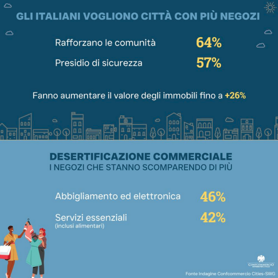 Negli ultimi anni si è assistito a un significativo cambiamento nelle abitudini dei consumatori che si sono orientati sempre di più verso un approccio non consumistico. Un trend che - come si sta riscontrando anche in questo fine agosto - ha coinvolto il settore moda, dove il valore dell’autenticità e della sostenibilità sta prevalendo sull’acquisto sfrenato e a tutti i costi. Secondo un'indagine realizzata da Confcommercio con Swg gli italiani vogliono vivere nei quartieri dove ci sono più esercizi di prossimità perché questi rafforzano le comunità (per il 64% degli intervistati), fanno sentire più sicure le persone (57%) e fanno crescere il valore delle abitazioni (fino al 26% in più). La chiusura dei negozi preoccupa per il timore di un aumento del degrado, di disoccupazione e di rischi di spopolamento. E i negozi che stanno scomparendo di più sono proprio quelli dell’abbigliamento (46%).