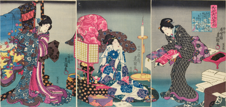 Pattern di broccato moda del Palazzo Imperiale, stampa, realizzata da Utag Utagawa Kunisada, 1847-1852, Giappone. Museum no. Circ.636 to Circ. 638– 1962. © Victoria and Albert Museum, London