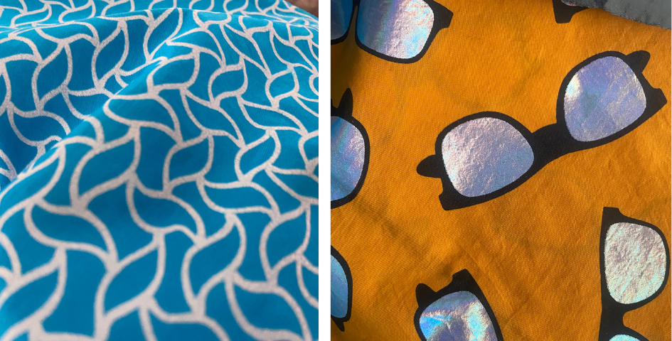 Questa tecnica innovativa (a destra), che applica la laminazione solo in alcune aree del tessuto, è totalmente custom-made, in linea con esigenze del settore lusso. In chiave di personalizzazione Taiana presenta inoltre nuove stampe a pigmento bianco su basi rigide di PES o PA (a sinistra).