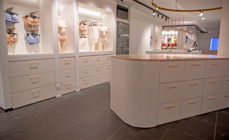 Questa precisa scelta riflette la filosofia del negozio, dove il prodotto non è mai pensato al di fuori dalla vendita assistita. Ogni cliente è seguita da una venditrice esperta e attenta, che si prende il tempo di osservare, ascoltare e proporre in modo mirato. All’origine del progetto c’è Lot Decock, erede di un savoir-faire familiare radicato da oltre trent’anni nel commercio della lingerie. Rimasta per lungo tempo distante da questo universo, che considerava troppo funzionale, Lot rivede la sua posizione affiancando la madre in una prima fase di espansione dell’attività. Forte di questo passaggio generazionale e provvista di una solida base, osa spingersi oltre e con il marito crea Ohlala: una boutique di ampio respiro, pensata da subito come un luogo di consulenza e di scelta. E l’interior design si sviluppa in linea con questa visione.