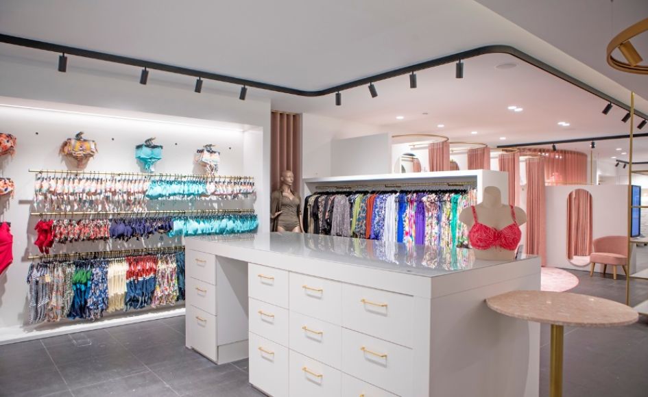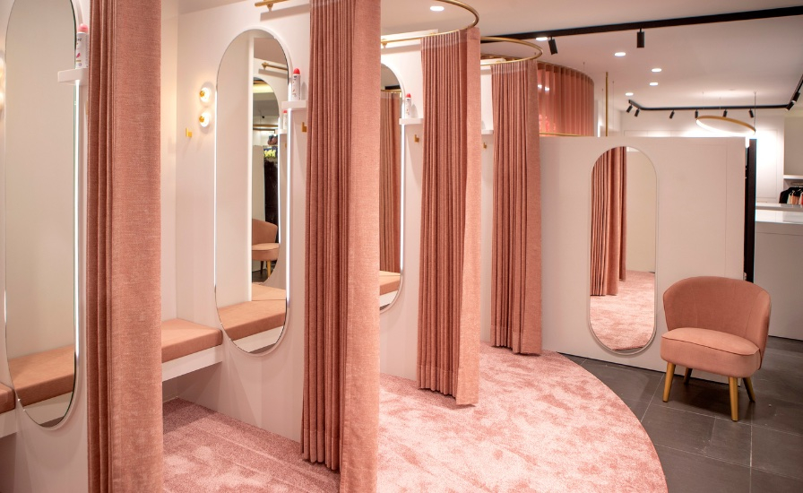 Ci piace per le cabine di prova concepite come vere e proprie crisalidi, dove volumi generosi, luci valorizzanti e tessuti avvolgenti trasformano il fitting in un’esperienza a sé.