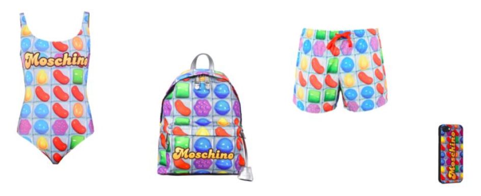 La collezione si compone di uno zaino, un iPhone case e capi swimwear uomo e donna, le cui grafiche si ispirano alle celebri caramelle multicolore protagoniste del videogioco per smartphone. Gli articoli, prodotti in edizione limitata, saranno acquistabili esclusivamente online sul sito Moschino.com da venerdì 14 aprile, per i seguenti paesi: Usa, Gran Bretagna, Francia, Germania, Spagna e Giappone.