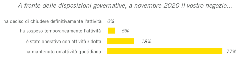 Il 18% del panel è rimasto operativo con attività ridotta: chi per disposizioni governative (i multimarca ubicati all’interno dei centri commerciali, chiusi 7 giorni su 7 in zona rossa, e il sabato e la domenica in tutta Italia), chi per scelta, al fine di contenere i costi in regime di scarsa affluenza. C’è chi ha scelto di ricevere solo su appuntamento e di puntare sull’home delivery. Solo il 5% (attività provinciali in zona rossa, negozi in località turistiche, con business stagionale estivo, o invernale proiettato alle – ahinoi – poi precluse vacanze di fine anno) ha sospeso temporaneamente l’attività dopo il DPCM di novembre.