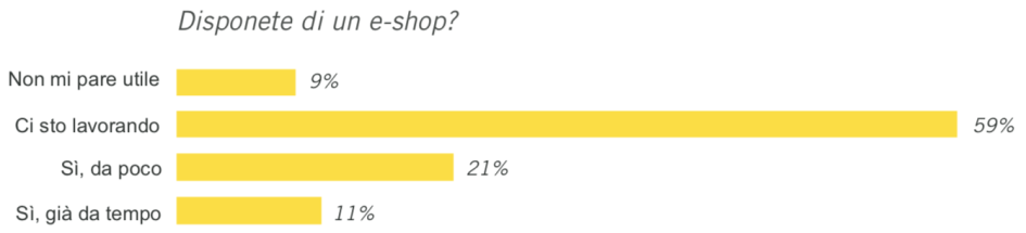 Va sottolineato che, per “e-shop,” i negozi coinvolti nel sondaggio non intendono però solo il proprio negozio online, ma anche siti di vendita affiliati ad altre piattaforme (come ebay o shopify), da molti plebiscitati. L’adozione di un e-commerce vero e proprio rimane del resto controversa e, anche tra chi ha già testato il canale, non mancano le perplessità.