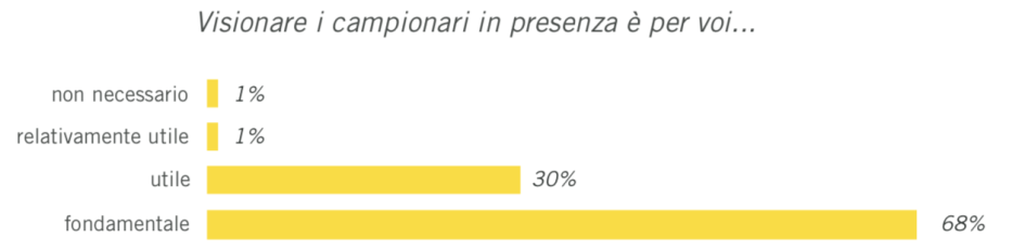 Visionare le collezioni in presenza è fondamentale per il 68% del panel. E per la quasi totalità dei rispondenti (98%) la chiave è, in primis, il fatto di toccare con mano i prodotti: per testare comfort e piacevolezza dei materiali, per valutarne il fit, ma anche per apprezzarne lo stile e i colori, la fattura e le lavorazioni… In sintesi, per vivere in prima persona l’emozione di un capo che in negozio dovrà poi emozionare il cliente. Un nodo cruciale soprattutto nel mare (“Il beachwear vive di piccoli particolari che si apprezzano solo toccando il prodotto”, Casa del Costume, Senigallia), e in generale quando si parla di moda e si lavora sugli abbinamenti total look.