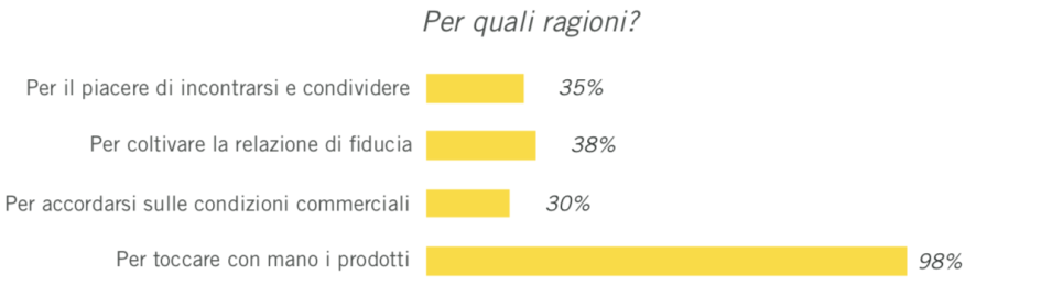 Nello scoprire dal vivo le collezioni c’è poi anche l’aspetto "umano": coltivare un rapporto di fiducia con i marchi è importante per il 38%, e il 35% apprezza il momento di incontro e di scambio con i fornitori. “E’ utile conoscere di persona i referenti dei brand e curare il rapporto diretto anche con i titolari, nell’ottica di confrontarsi e fornire il miglior servizio al consumatore finale” (Fiordipelle, Roma). L’aspetto della trattativa non va sottovalutato: il 30% ritiene utile, per accordarsi sulle condizioni commerciali, l’incontro vis-à-vis.