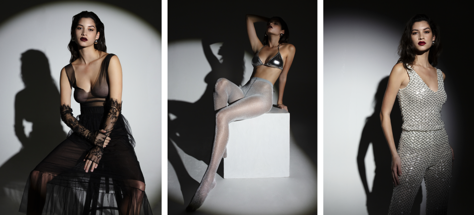 Maglie e gonne in tulle declinate nell’intramontabile nero, completi top e pantalone nel più scintillante avorio, arricchiti di paillettes, giochi di trasparenze e pizzi rimandano a uno scenario parigino dove borchie, collant a rete, applicazione di perle e catene gioiello arricchiscono capi pensati per esaltare la più profonda bellezza femminile.