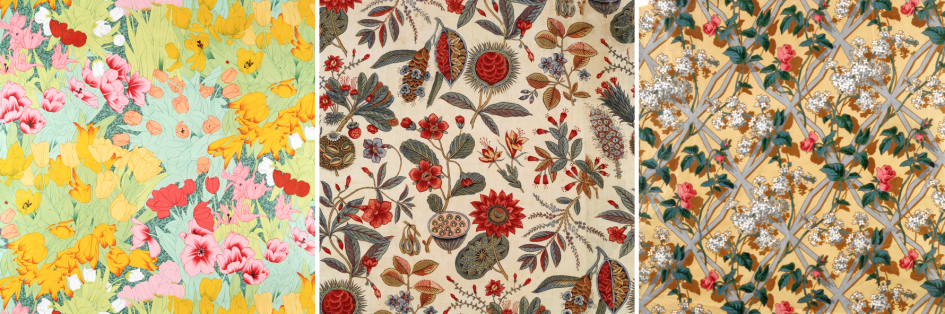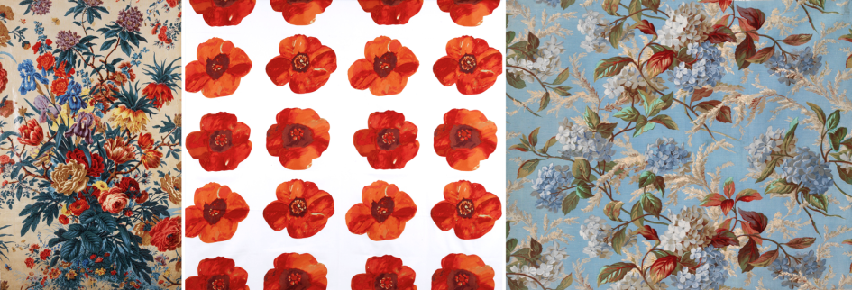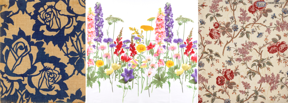 L’esplosione floreale su stoffe e tessuti si nutre di una creatività che si rinnova senza sosta. Nelle composizioni floreali, i disegnatori fanno a gara con l’immaginazione: ramage, fiori sparsi, a mazzi, in ghirlande o in bouquet, giocando su varie dimensioni in scala. Lo sviluppo della chimica offre una vasta palette di colori, trasformando le stoffe in veri trompe-l’œil per composizioni sofisticate. La rappresentazione dei fiori si rifà alle correnti artistiche: ai fiori raffinati del XVIII secolo e alle composizioni realistiche della seconda metà del XIX secolo segue una stilizzazione ispirata alle avanguardie del primo ‘900.