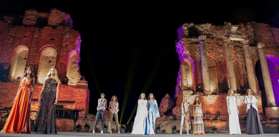 Sabato 21 luglio, nella cornice unica e prestigiosa del Teatro Antico di Taormina (trasformato per l’occasione in una grandiosa passerella) la stilista Raffaela D’Angelo ha preso parte alla notte più glamour del Sud Italia presentando due look della collezione Cruise 2018: un bikini dalla stampa macramé abbinato ad un lungo caftano in seta stampata e un abito lungo con frange; un omaggio alla Sicilia, da cui Raffaela D’Angelo prende spunto per disegnare le sue collezioni.