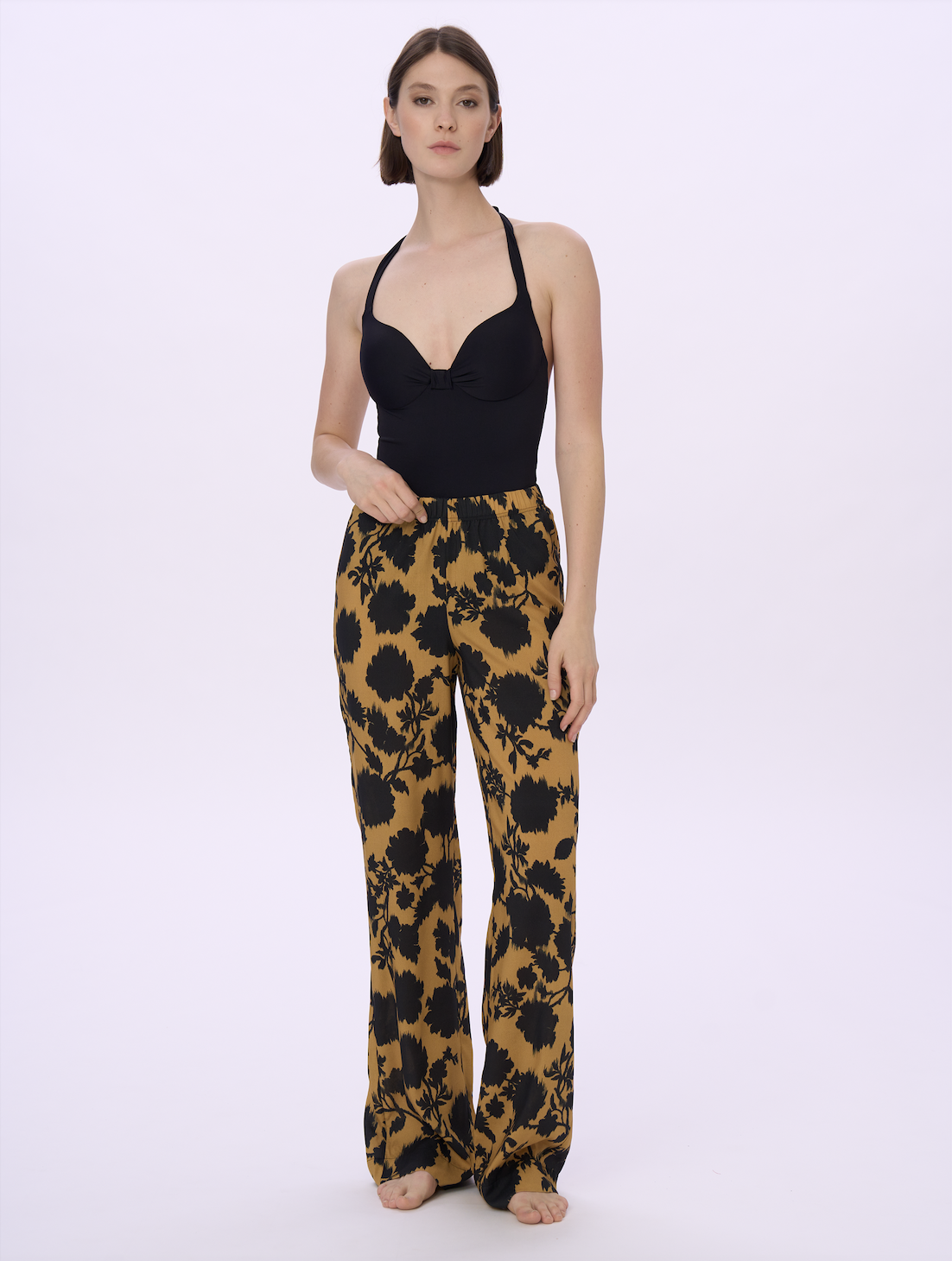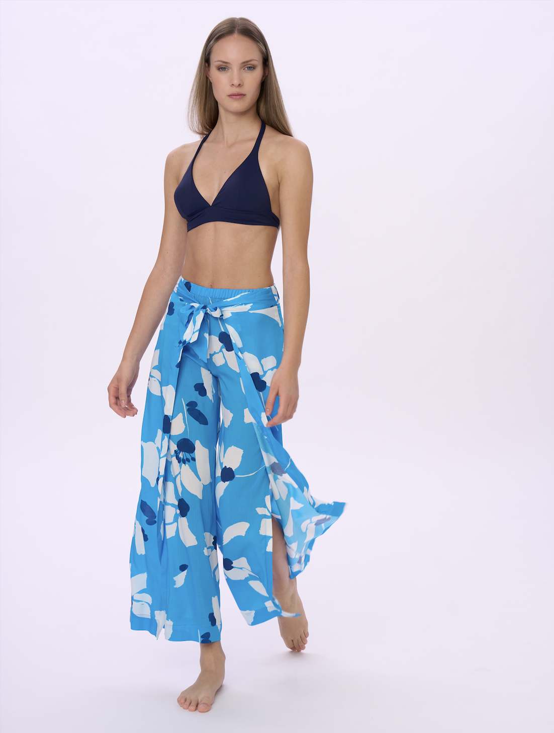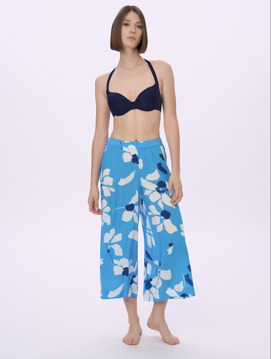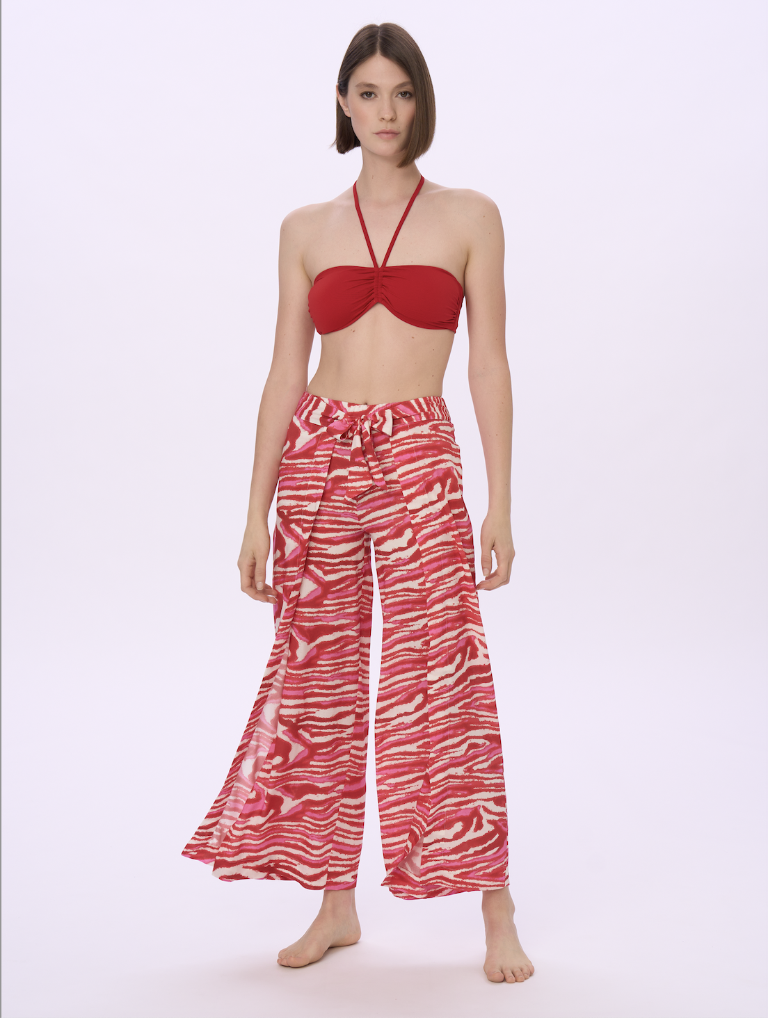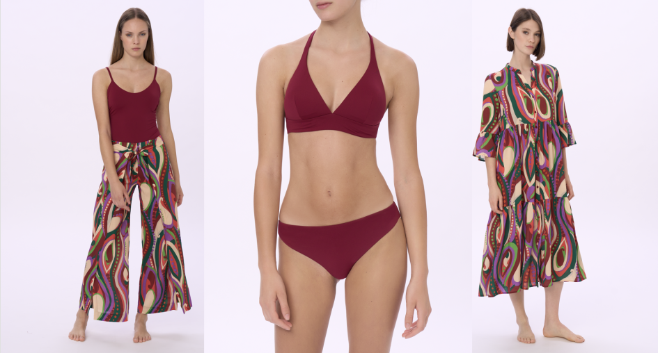 Sviluppati su varie basi tessuto (jersey o tela, in fresca e naturale viscosa) e in varie forme e lunghezze, gli abiti mare sono protagonisti della collezione, che si completa con una proposta di maglie e pantaloni, uniti e stampati, in tessuti fluidi per un utilizzo crossover ai vari momenti della vacanza (e non solo…). Nella loro essenzialità minimale, i costumi sposano anch’essi un concetto contemporaneo che mette il comfort all’indosso e il potere del colore al servizio del benessere del corpo: niente ganci, solo semplici allacciature, e costruzioni pulite per modellistiche che si adattano anche a vestibilità curvy, senza rinunciare a forme moderne e accattivanti sul lato B, con tagli brasiliani per slip o culotte.