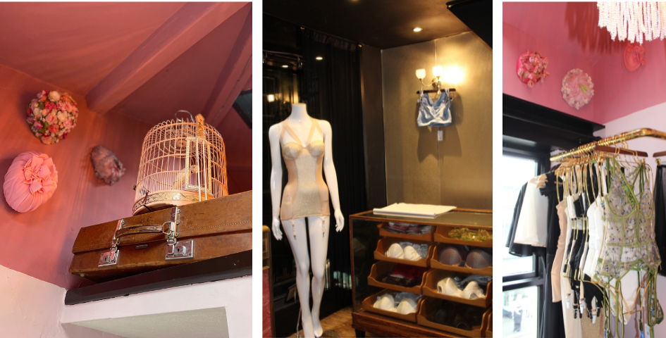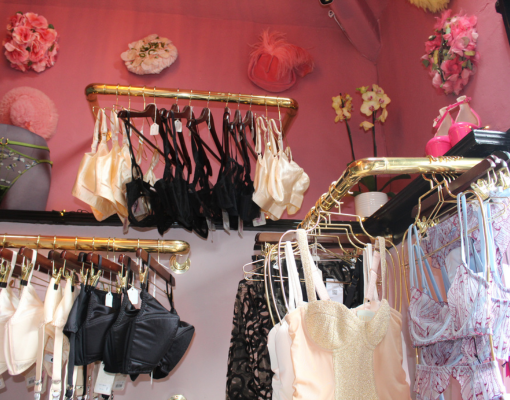 All'interno lo spazio di soli 9 mq, distribuito su due livelli, è stato riarredato in occasione della riapertura: su fondo rosa, il mobilio in stile art déco si ispira all'opulenza e alle sontuose tappezzerie del Venice Simplon Orient Express, dove Jenna ha avuto il piacere di alloggiare in luna di miele. La piccola scala in legno, affiancata da un mosaico di piastrelle dorate, invita a passare al piano superiore, dove appenderie in ottone posizionate a diverse altezze ottimizzano lo spazio espositivo per la lingerie di pregio. Tessuti raffinati, mobili antichi, una selezione di cappelli vintage e un copricapo burlesque degli anni '30 conferiscono alla boutique uno spirito deliziosamente retrò. In procinto di ampliare l’offerta con marchi britannici e internazionali di fascia alta, Jenna prevede inoltre di affittare il negozio a fotografi e marchi per i loro shooting.