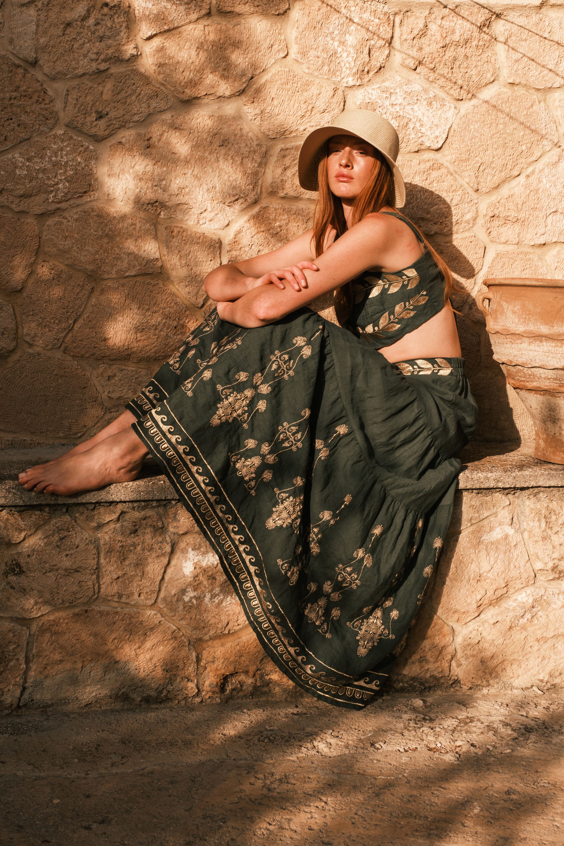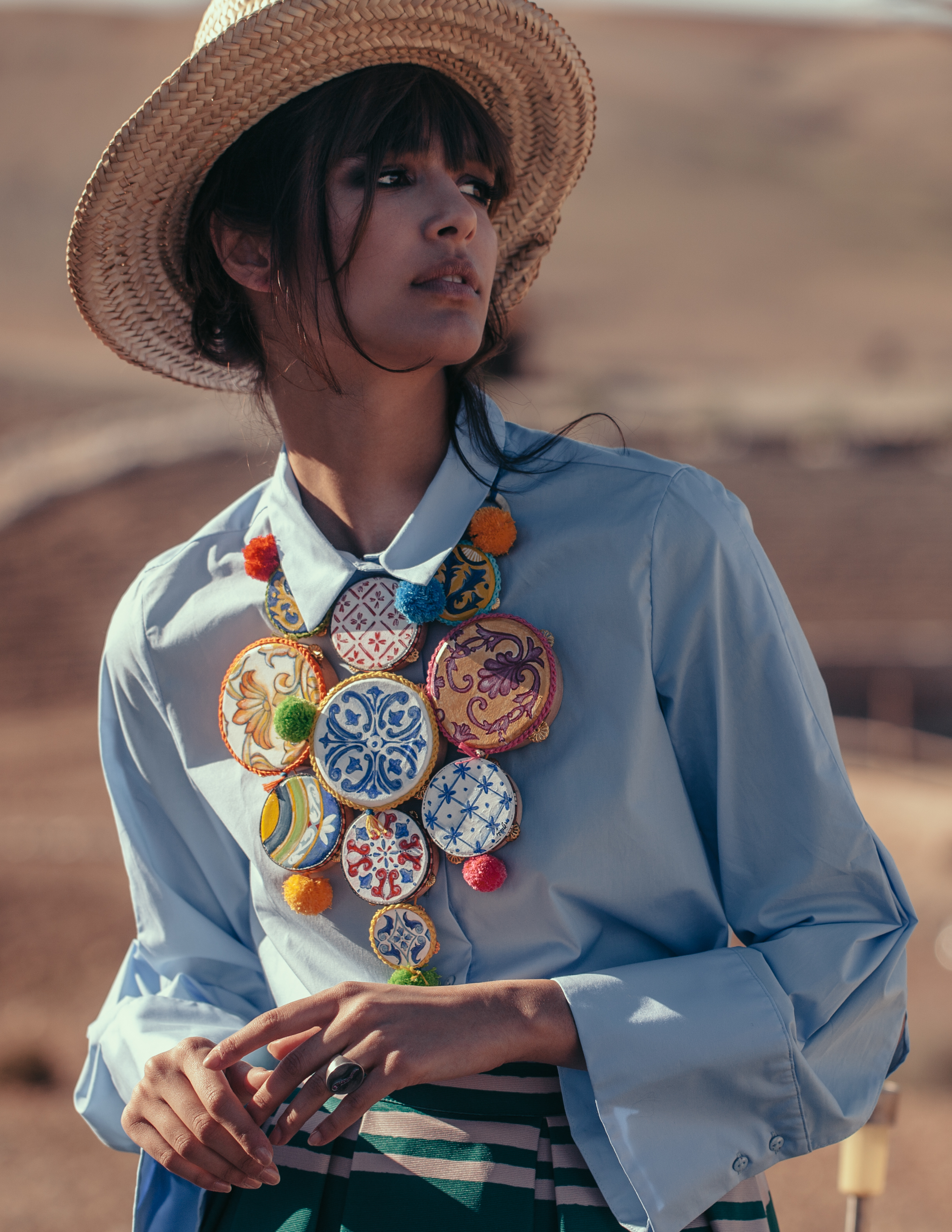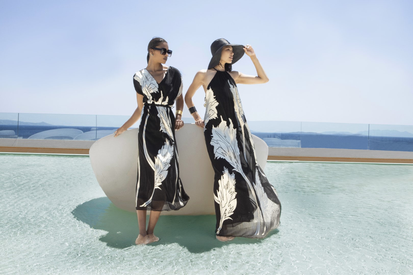 In alto: resortwear Monnur; sciarpe foulard Fiamma Dinelli; cappello Danié; bijoux Agapis