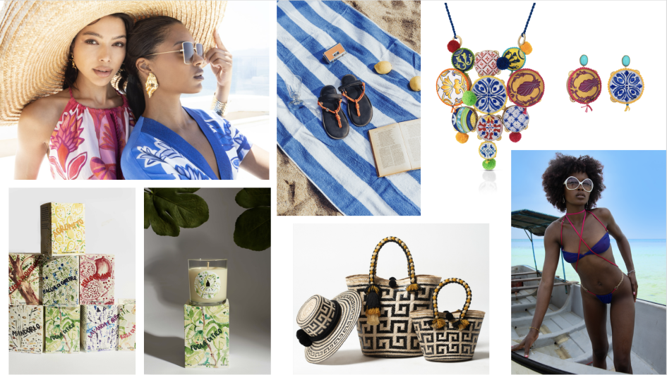 In alto: resortwear Aggél; infradito Flowze; bijoux Amlé; bikini Omuamoon; borse e cappello Knowmad; profumi e candele Carola fra i trulli