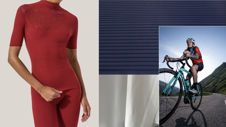 A sinistra un articolo Wolford Athleisure realizzato con tecnologia WKS di Cifra, al centro due tessuti Penn Solutions, in basso a destra un capo performance con tessuti Sitip