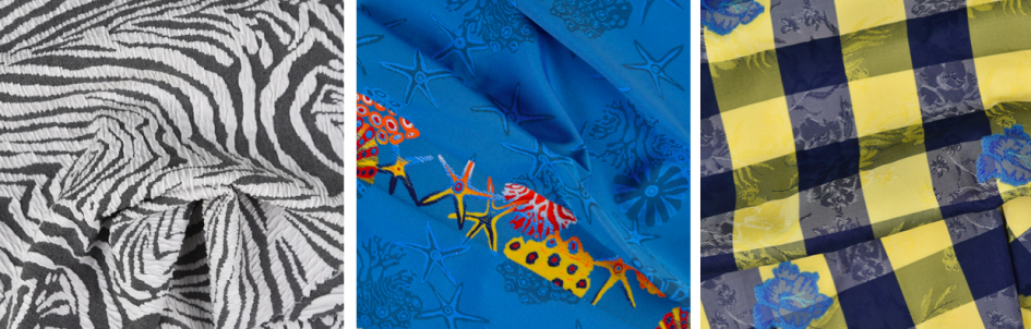Come lancio in pre-collezione 2023 Taiana Blu ha presentato due nuovi tessuti tinti in filo prodotti con materiali riciclati: Meg (a sinistra), un bi-stretch woven jacquard per costume da bagno donna, e Kloppy-Le-Relyfe (al centro), con motivo jacquard piazzato effetto passamaneria per boxer mare. Per il beachwear uomo l'articolo Adriatico, un non-stretch tinto in filo realizzato in 100% poliestere riciclato New Life, è disponibile in nuove versioni, tra cui Adriatico FC, un tessuto scozzese arricchito da motivo fil coupé (a destra).